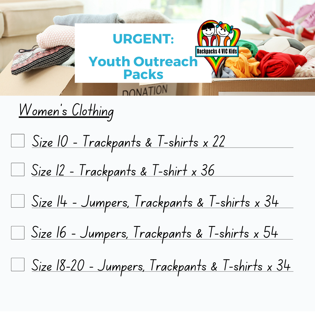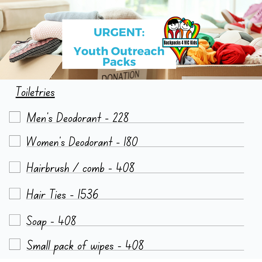 Each week we’ll highlight the most needed items to help complete our My Essentials, School Essentials, Youth Outreach and Santa Packs. Whether it’s one item or a few, your kindness helps bring comfort, dignity and hope to babies, children and young people doing it tough.